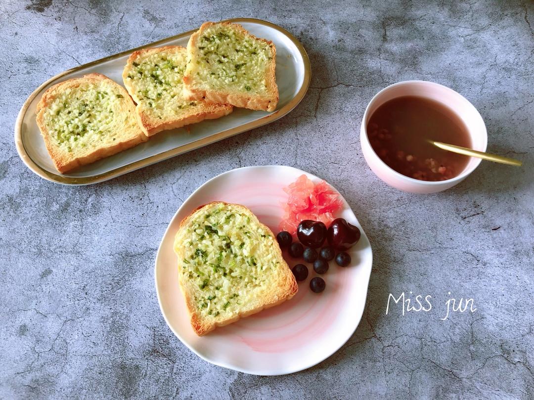 「今日食:蒜香吐司片+赤小豆薏米汤+西柚+车厘子+蓝莓」