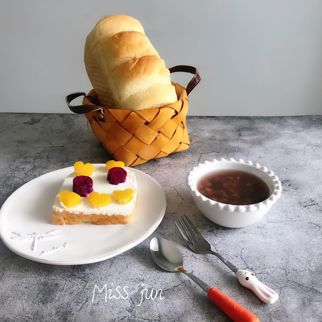 「今日食:水果奶油吐司+红豆薏仁汤」