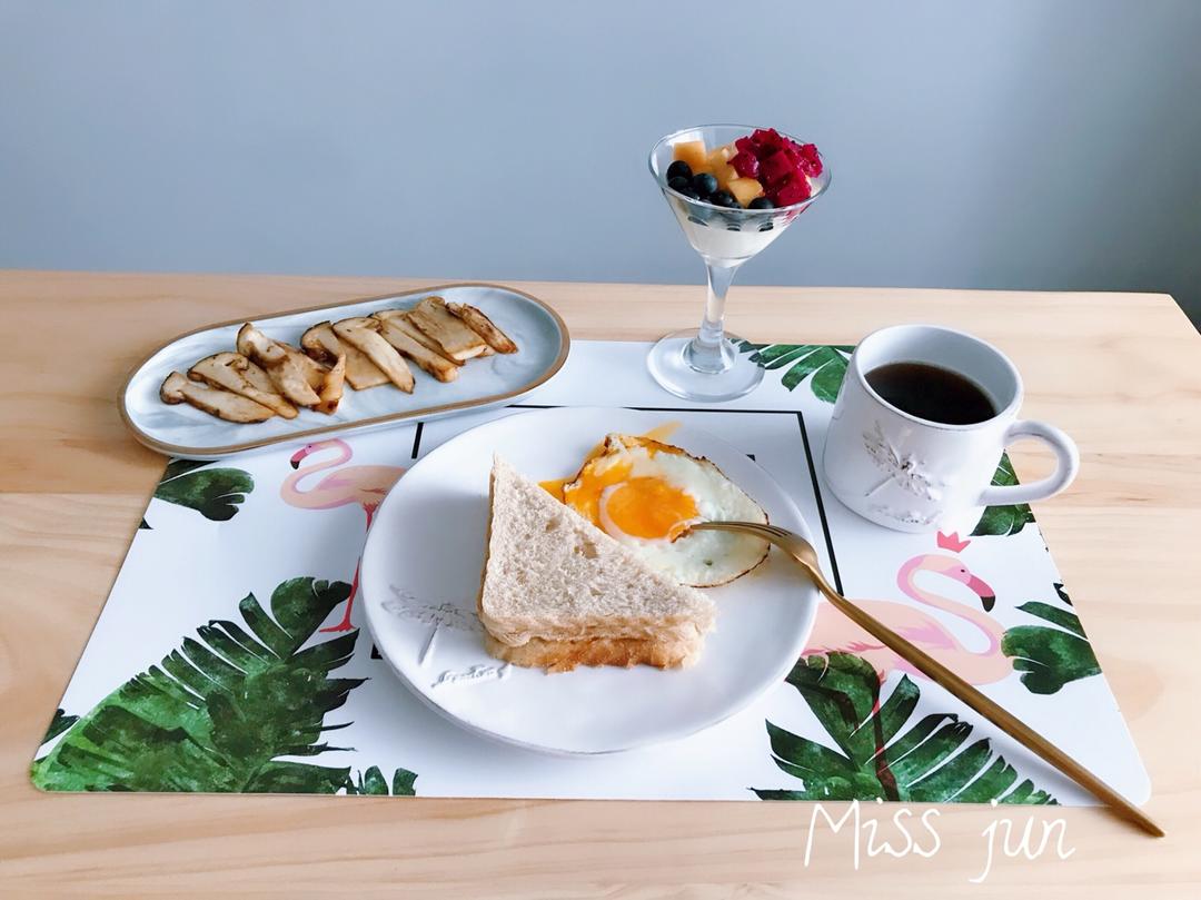「自制全麦吐司+煎蛋+黄油煎松茸+香草白巧克力慕斯水果杯+美式」