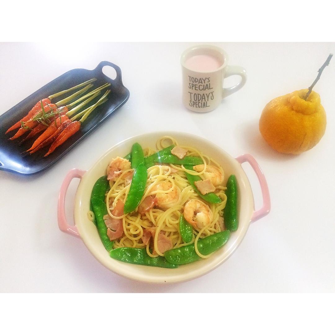 荷兰豆培根虾炒意大利面+蜂蜜烤小胡萝卜+草莓牛奶+柠檬橙