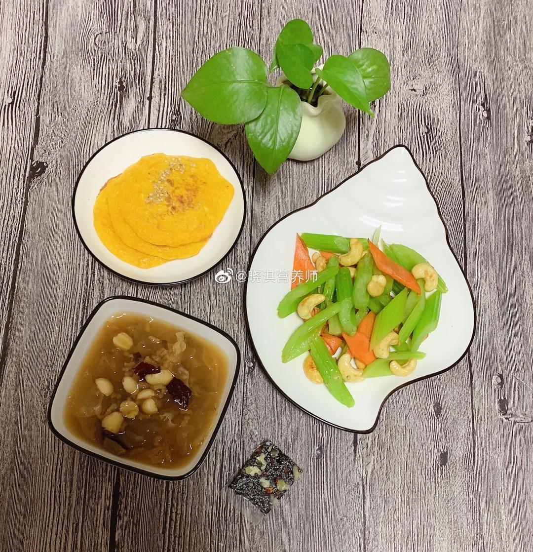 南瓜鸡蛋饼+银耳粥+芹菜腰果