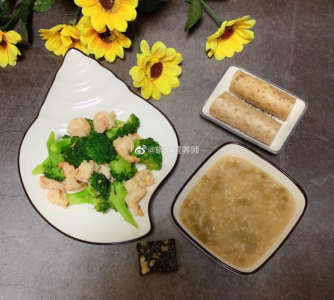 蒸山药+绿豆粥+虾仁西兰花