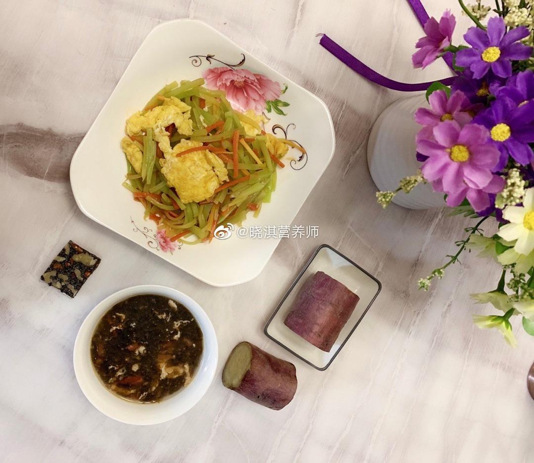 蒸红薯+青笋炒鸡蛋+紫菜蛋花汤