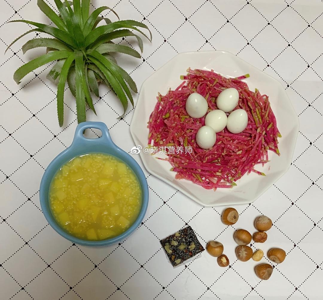 苹果小米粥+鹌鹑蛋+炝拌心里美萝卜+榛子