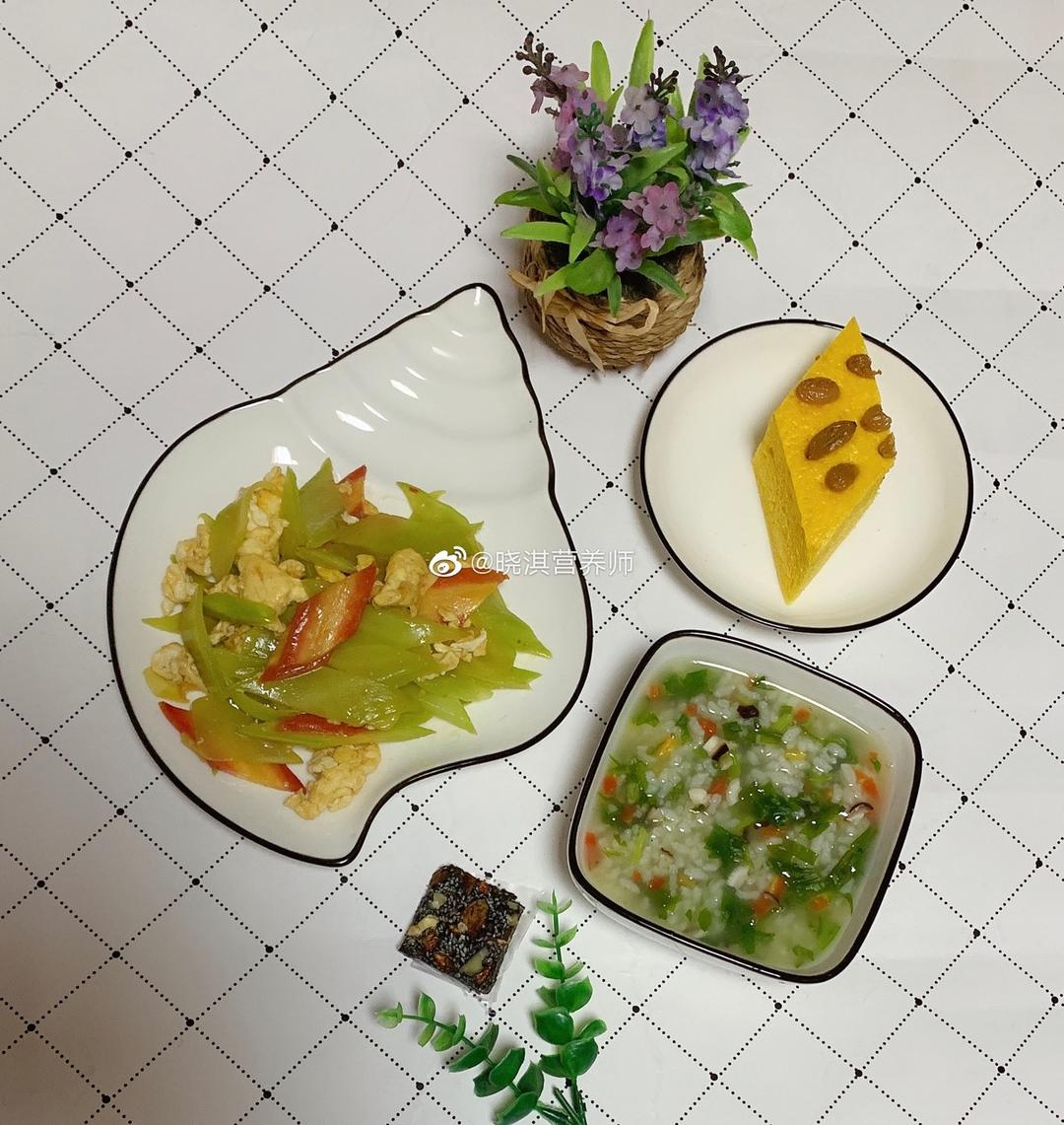 南瓜发糕+蔬菜粥+青笋炒鸡蛋