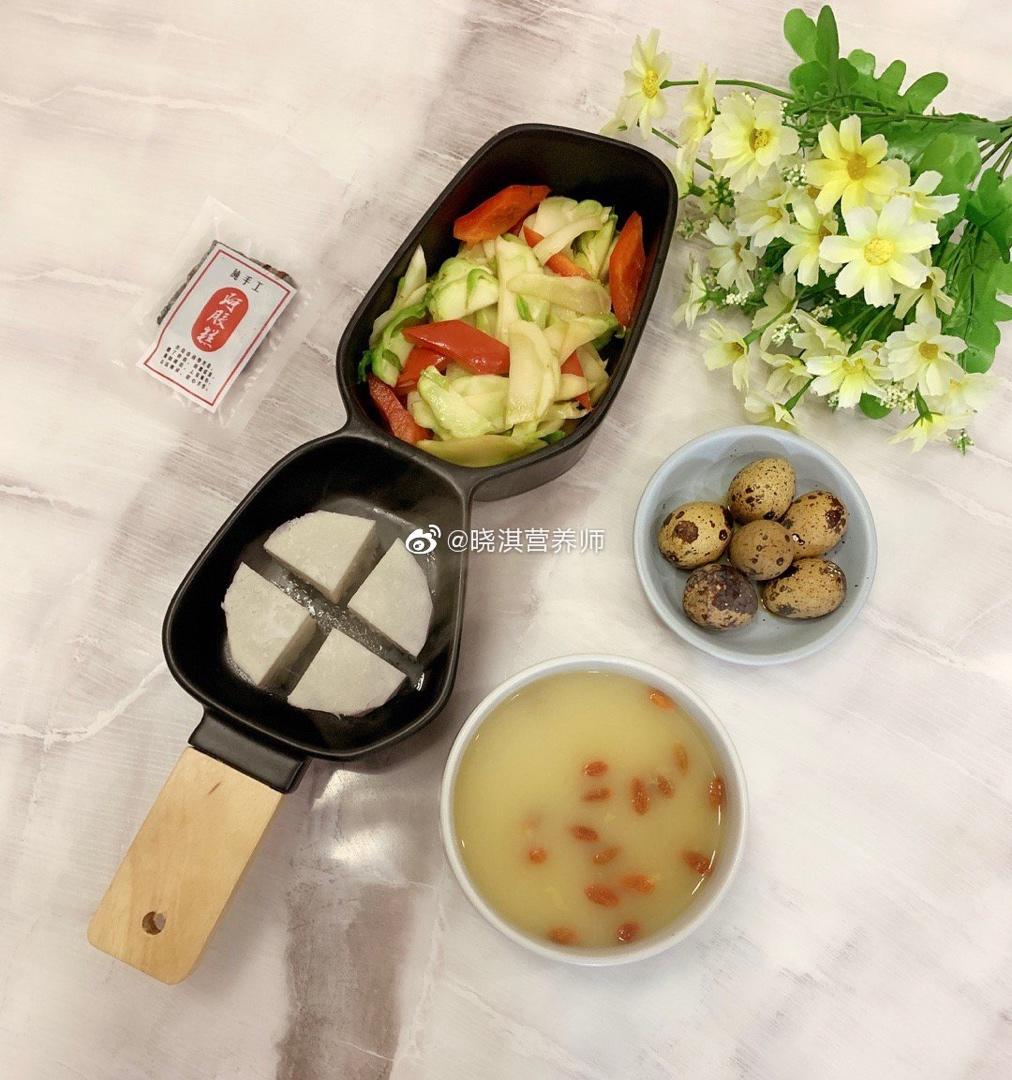 蒸芋头+卤鹌鹑蛋+柿子椒炒菜头+枸杞小米粥