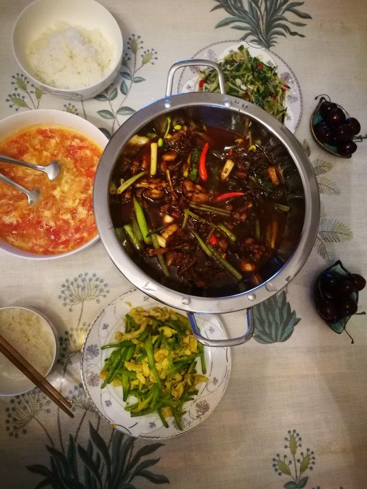今日晚餐:干锅牛蛙、黄花炒鸡蛋、凉拌豆芽粉丝黄瓜、西红柿鸡蛋汤,吃得心满意足!