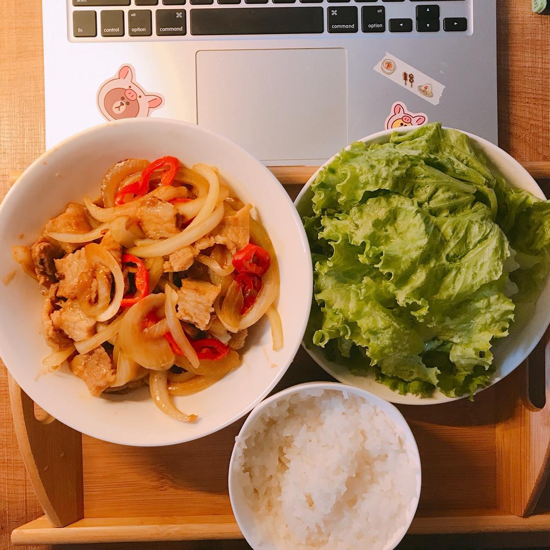 洋葱五花肉,配生菜