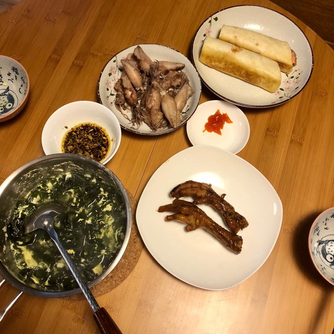 墨西哥牛肉卷+膏鱿+海带芽鸡蛋汤+自制酸辣鸡爪