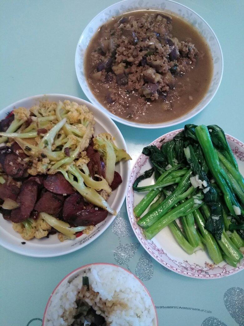 四十五分钟三个菜,蒜蓉菜心,腊肉菜花,肉末茄子