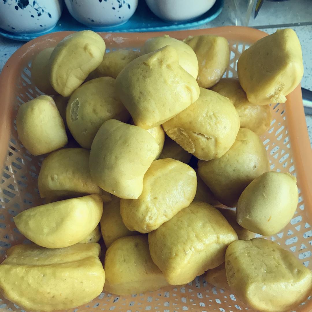 我来交作业了,挑了个简单款试试^ - ^发1.5倍时,嘴巴的白面团发得鼓起来了,吓得我压平后再蒸😅可能太大团了,包馅好难...