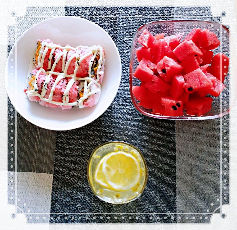 百香果柠檬茶,樱花寿司,西瓜。