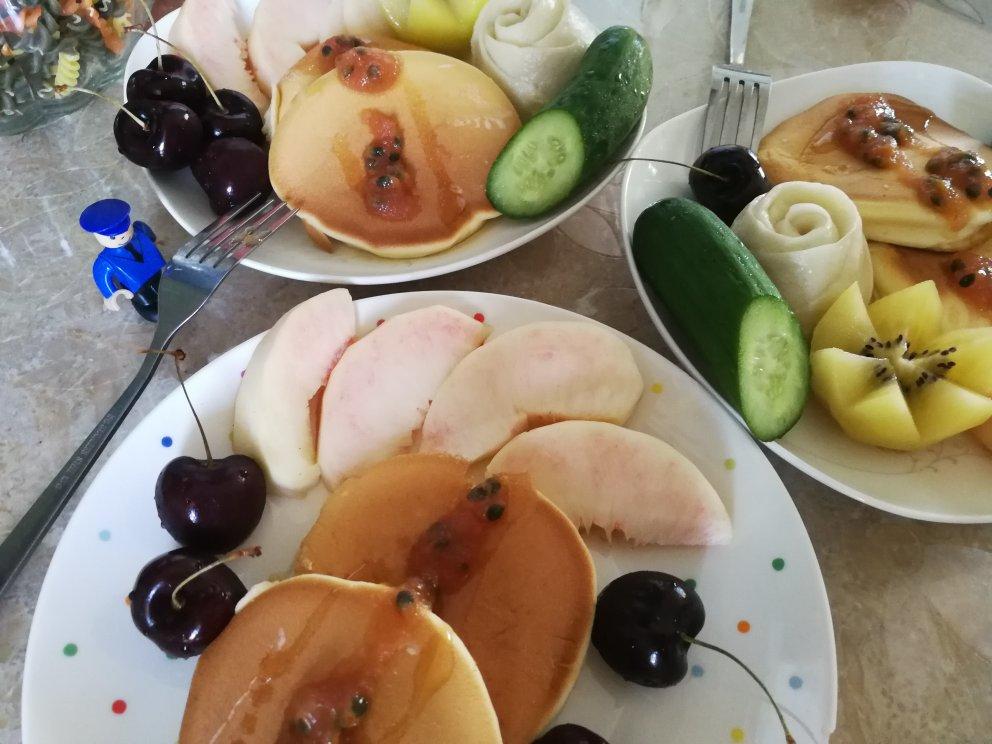 舒芙蕾松饼配自家百香果酱+没发起的花馒头+桃子樱桃奇异果小黄瓜+还有牛奶……吃饱就要去拔智...