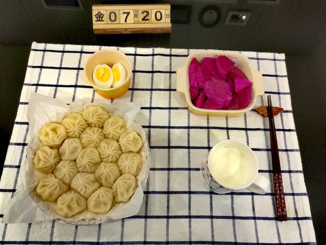 今日早餐:灌汤小笼包+鸡蛋+牛奶+火龙果