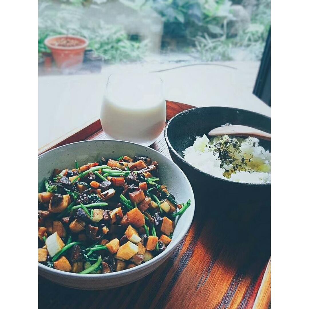 香菇炒茭白丁、土豆饭、牛奶