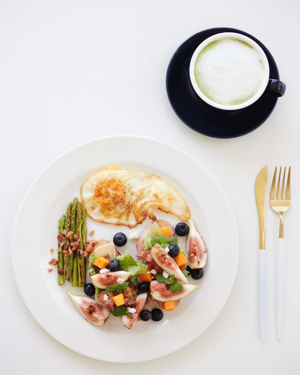 无花果培根奶酪欧包三明治➕芦笋➕煎蛋➕抹茶拿铁,刀叉是用马拉松的优惠券买的。嘿嘿