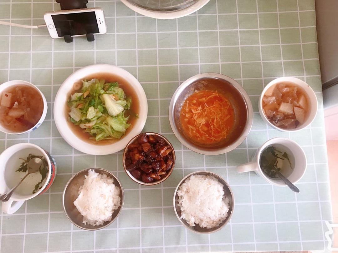 2018.11.19午餐~卤肉饭&蚝油生菜&番茄金针菇&银耳雪梨汤&蒲公英茶
