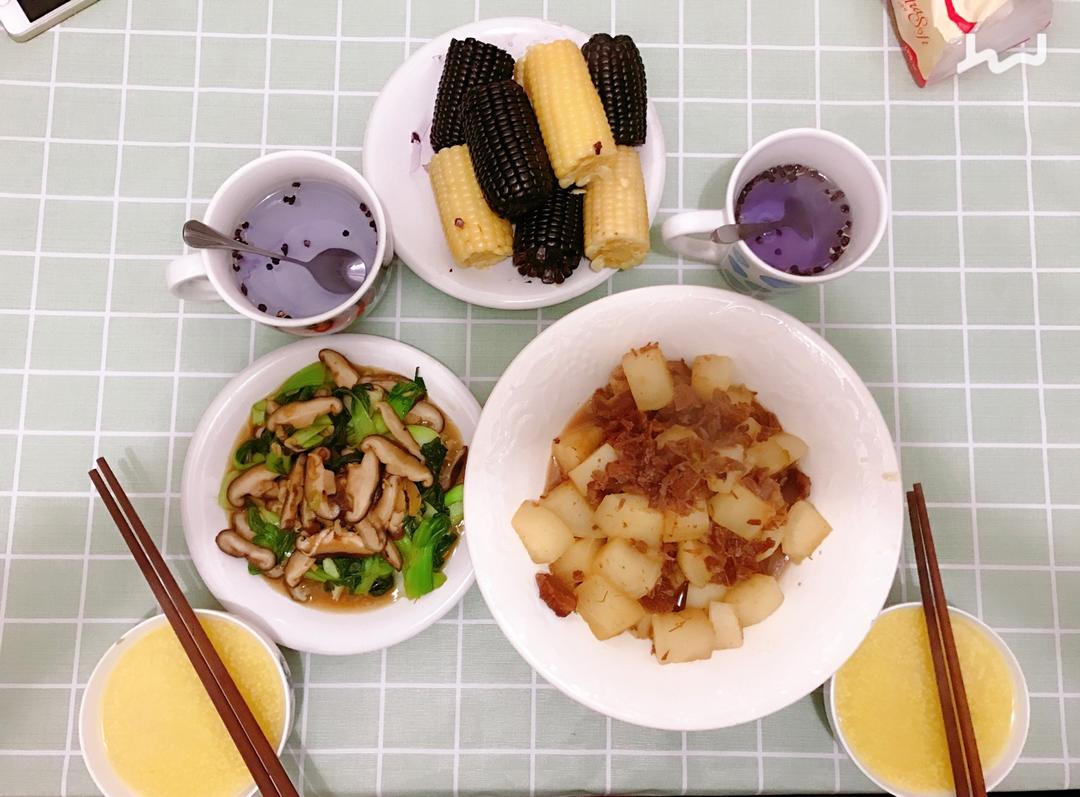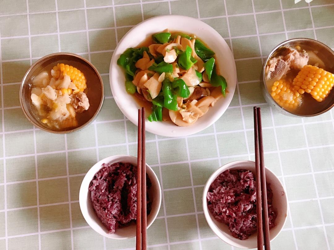 紫米饭&玉米山药排骨汤🌽&青椒杏鲍菇