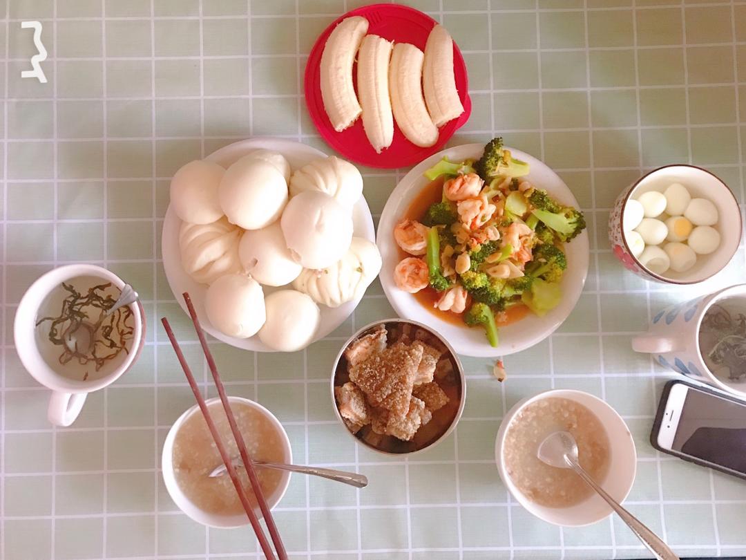 红米绿豆荞麦粥&西兰花虾球&豆包花卷&鹌鹑蛋&炸鸡&am...