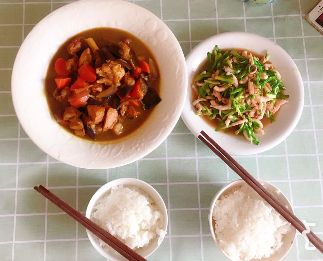 咖喱鸡腿&鲜鱿鱼炒蒜苗