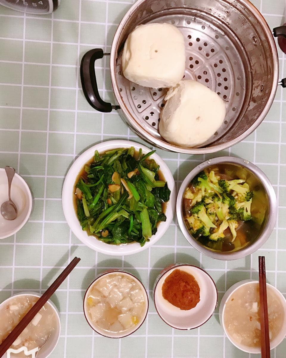 清炒绿叶蔬菜&蒜蓉西兰花&红烧狮子头&白萝卜排骨汤&银耳山药杂粮粥#晚餐•2018年11...