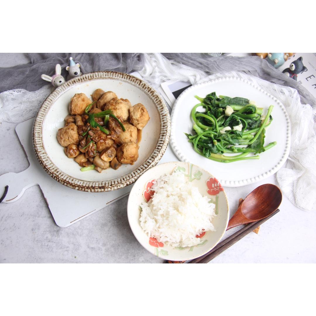 今日午食:酱烧鸡胸肉丸子➕清炒木耳菜