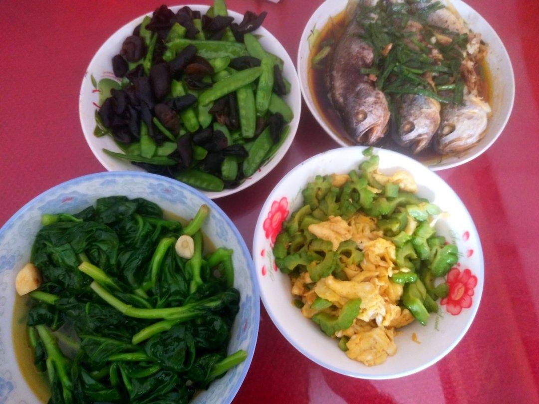 酸笋鱼,清炒木耳菜,香菇干贝排骨汤,银耳莲子红枣海底椰汤