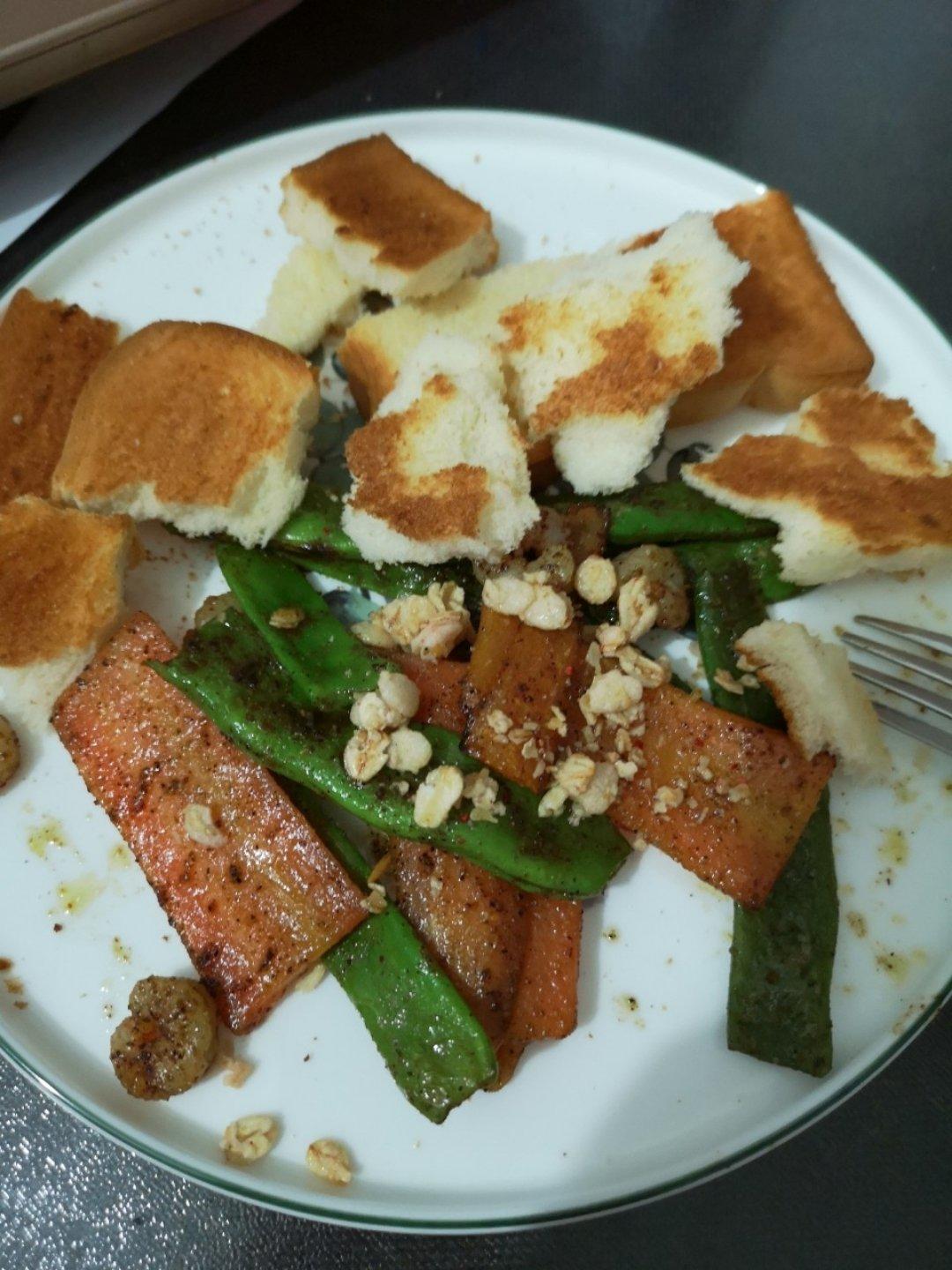 烤面包,四季豆胡萝卜虾仁。热巧克力牛奶。