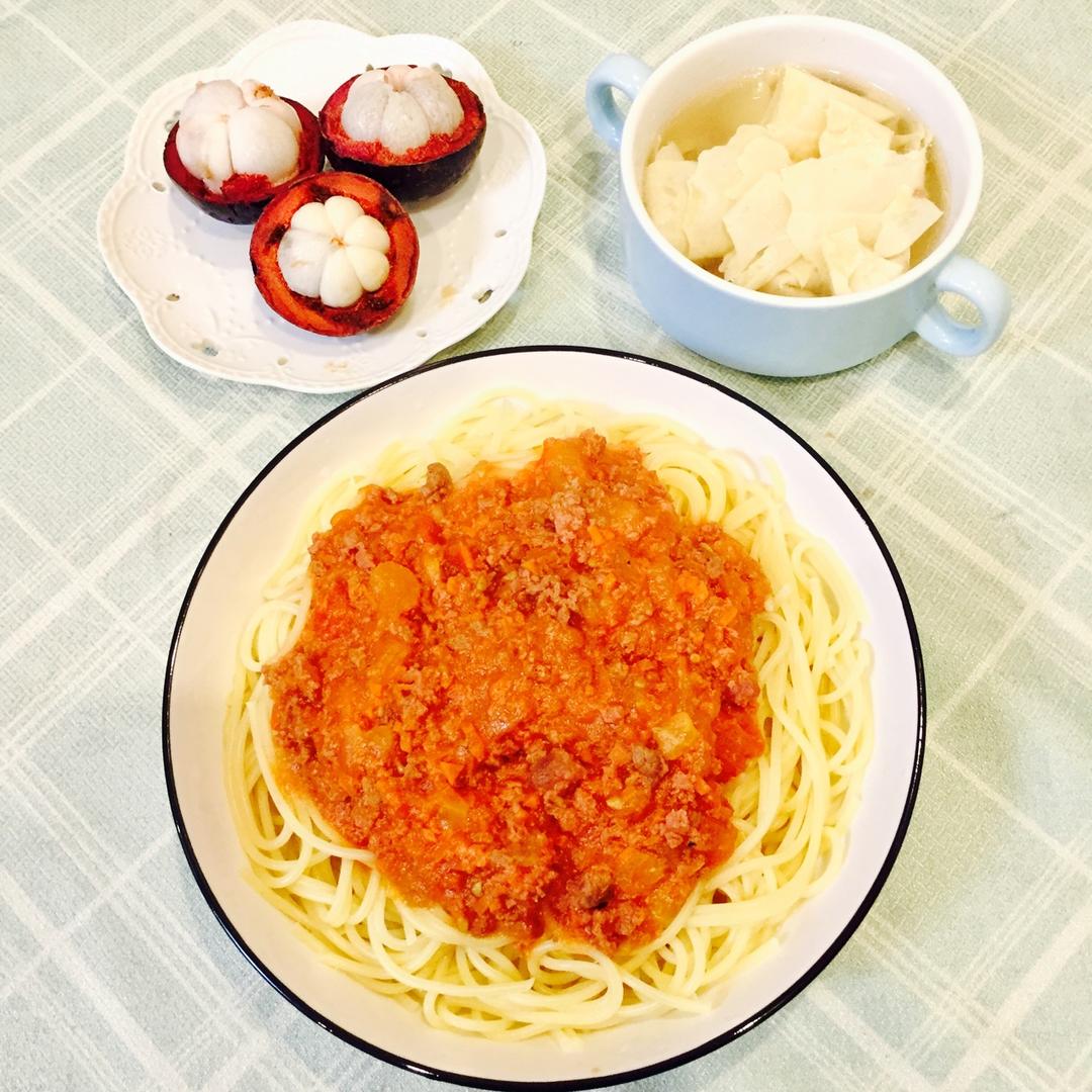 番茄牛肉意面🍝🍝,腐皮汤,山...
