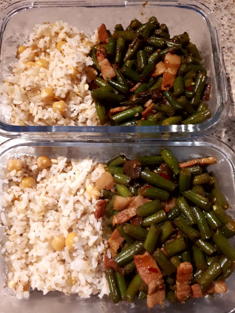 藜麦鹰嘴豆米饭+培根四季豆,用郫县豆瓣酱炒和橄榄菜炒的,孩子说好吃