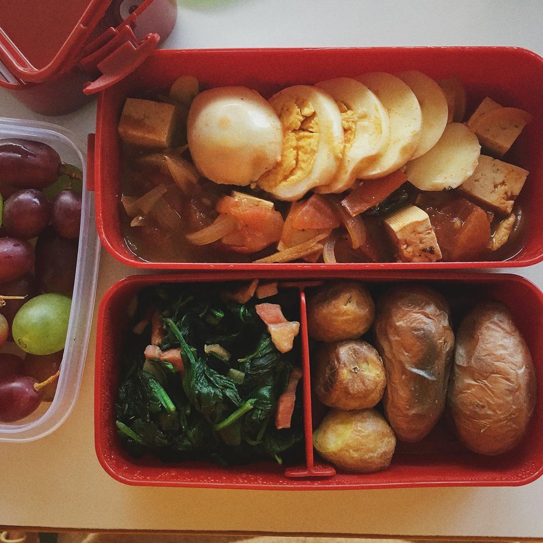 便当菜- 茄汁蘑菇豆腐+火腿炒菠菜+烤土豆+水煮蛋+提...