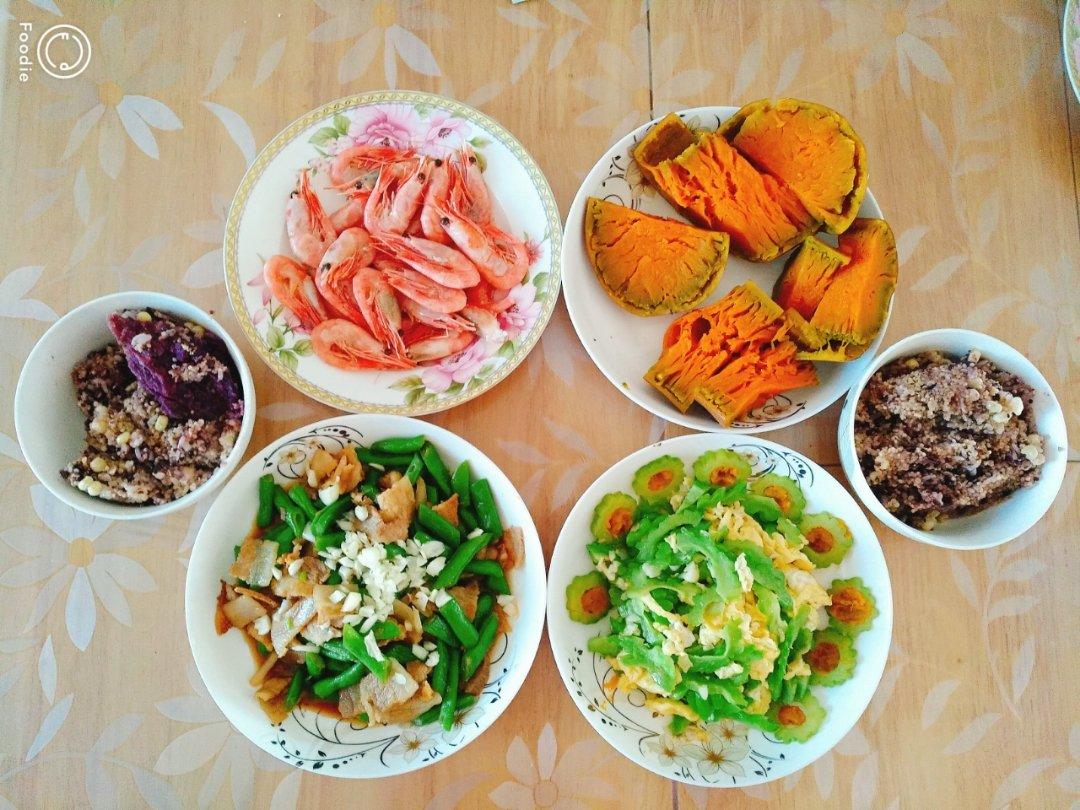苦瓜炒蛋,豆角炒肉,甜虾,南瓜,杂粮饭