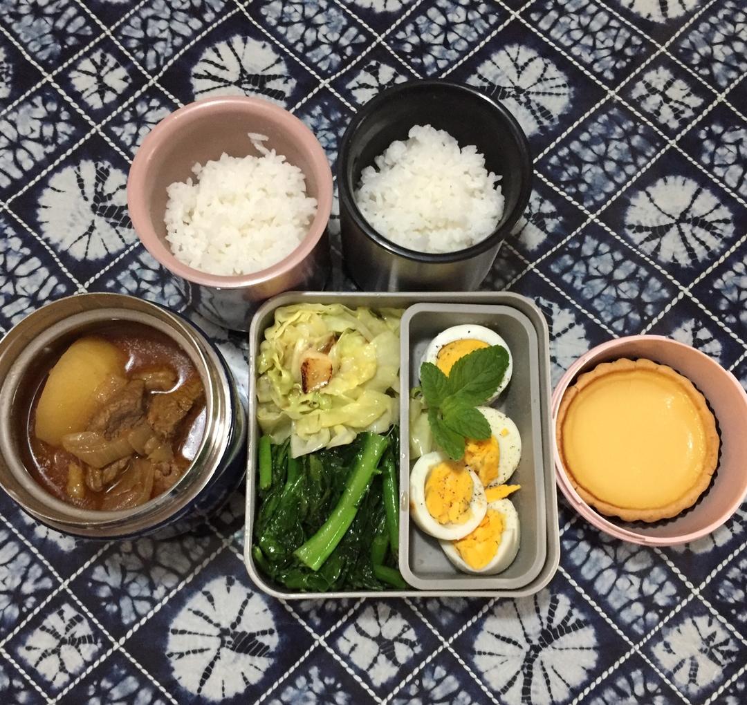 #Hannah's Lunch Box#咖喱牛肉、炒广东菜心、高丽菜和白煮蛋,蛋挞...