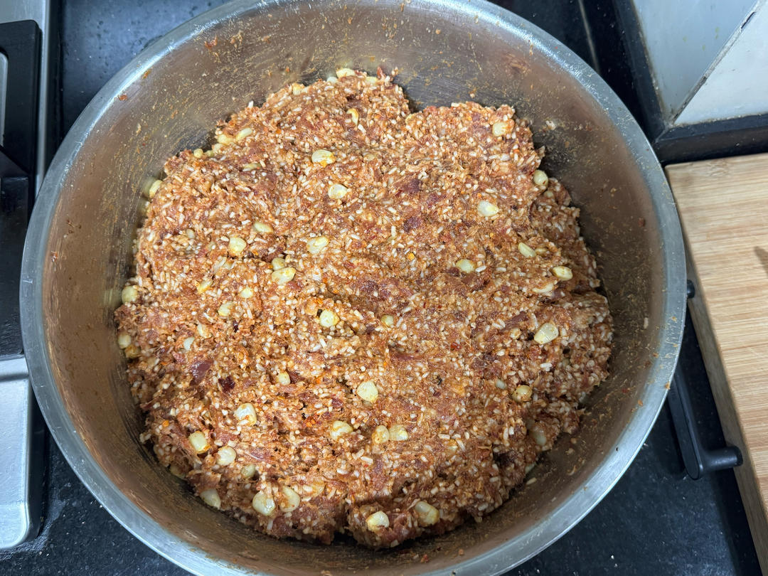 3、猪后腿肉4斤,(瘦肉粗颗粒,肥肉打细颗)