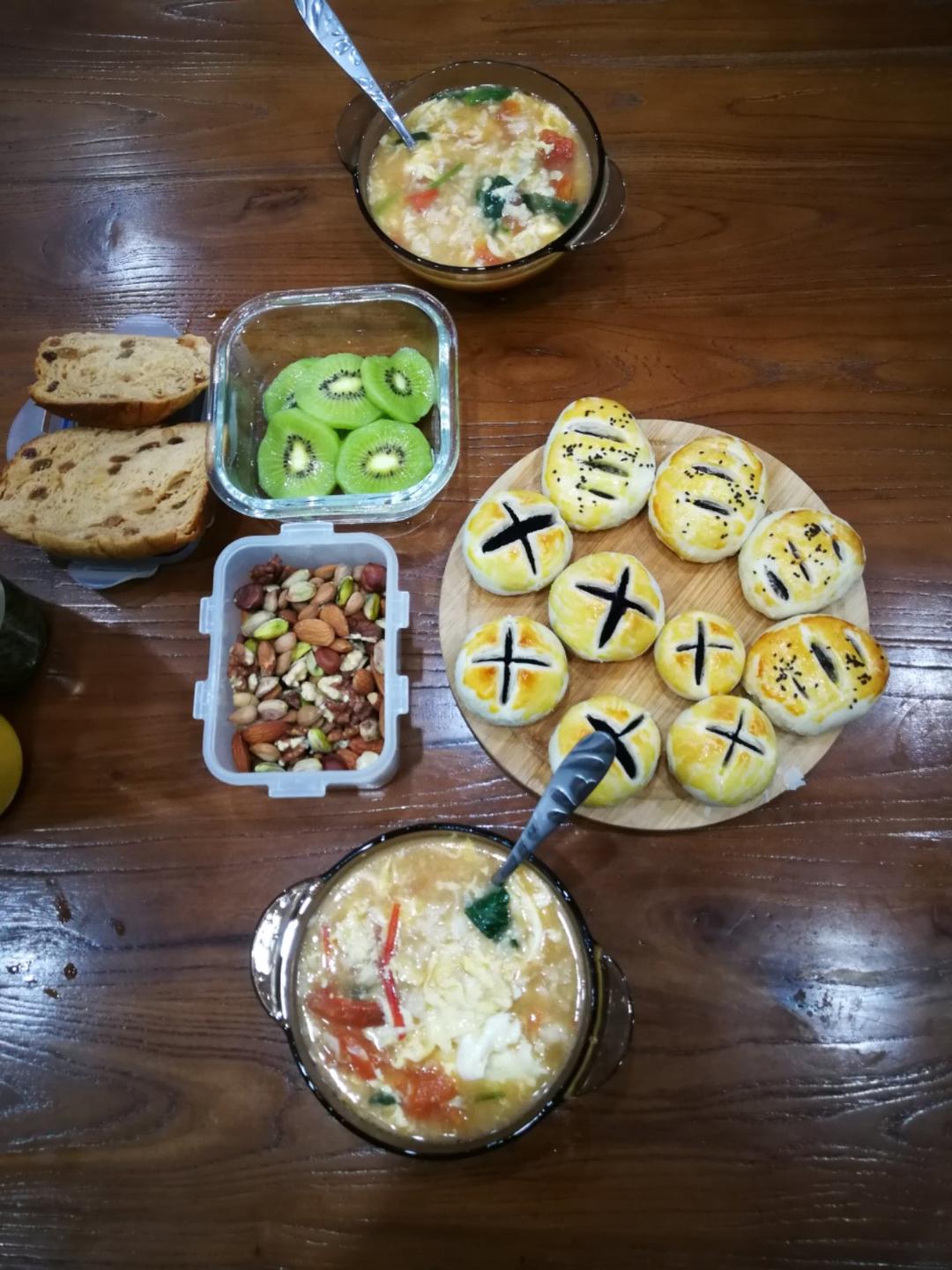 西红柿疙瘩汤,紫薯馅开口酥,紫米馅老婆饼,猕猴桃,干果