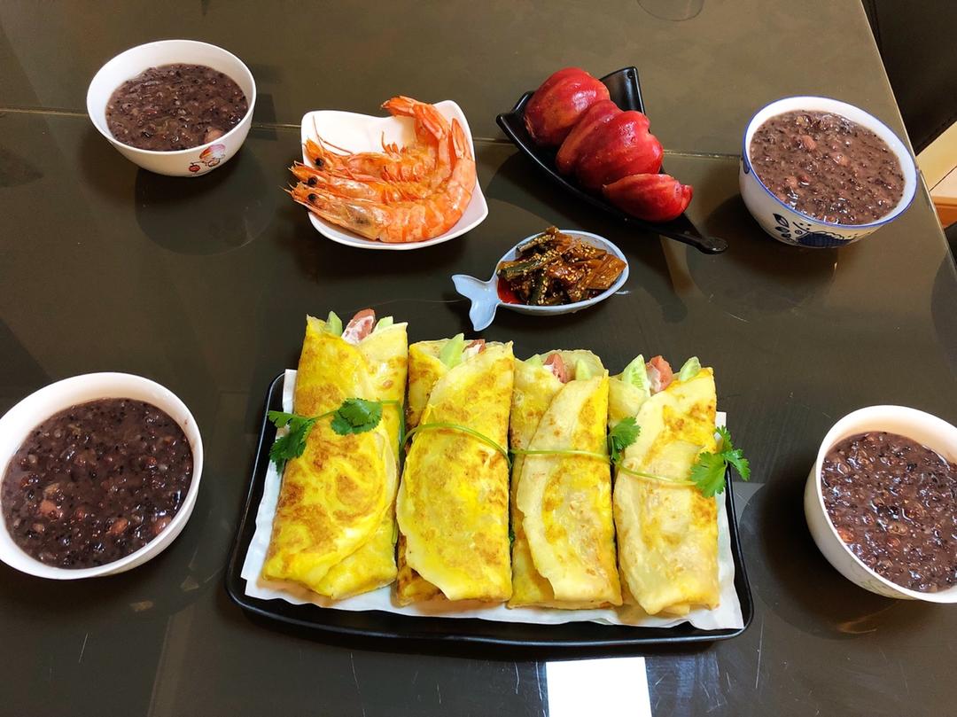 马大厨的煎饼果子(以后失业了准备街头练摊去)&八宝粥&虾&脆脆的莲雾