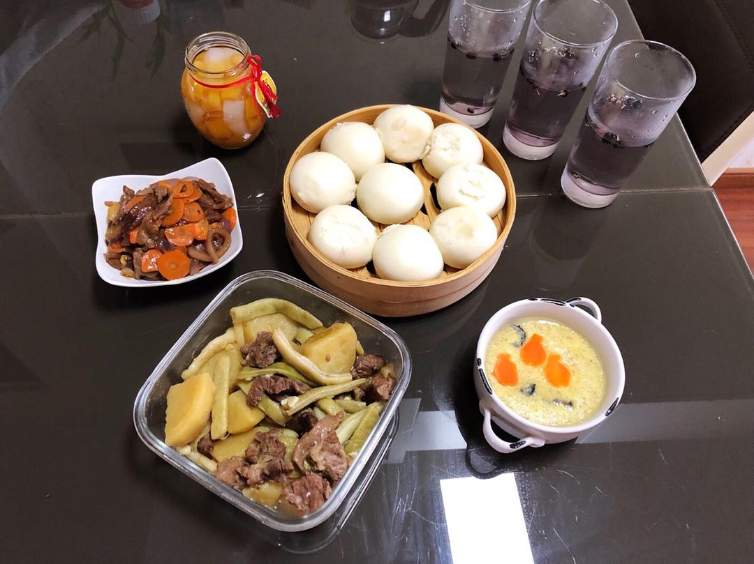 豆沙包.&大豆角&鸡蛋糕&什锦小罐头&香炒小牛排&黑枸杞水