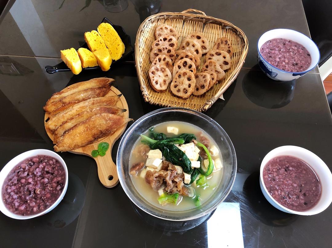 五谷杂粮粥&炸藕盒&舌头片鱼&饼子&小白菜豆腐汤