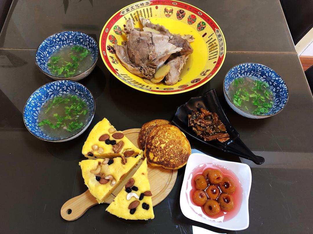 玉米发糕&妹夫给的内蒙羊腿(把肉剃下来了,昨晚小火熬了3个小时的羊棒骨)&汤&小萝卜咸菜&...