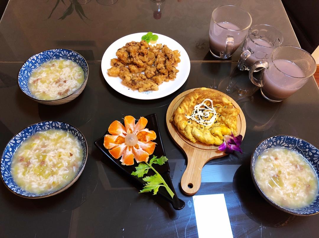 芹菜牛肉粥&鸡蛋饼&软炸肉&黑芝麻糊&丑橘