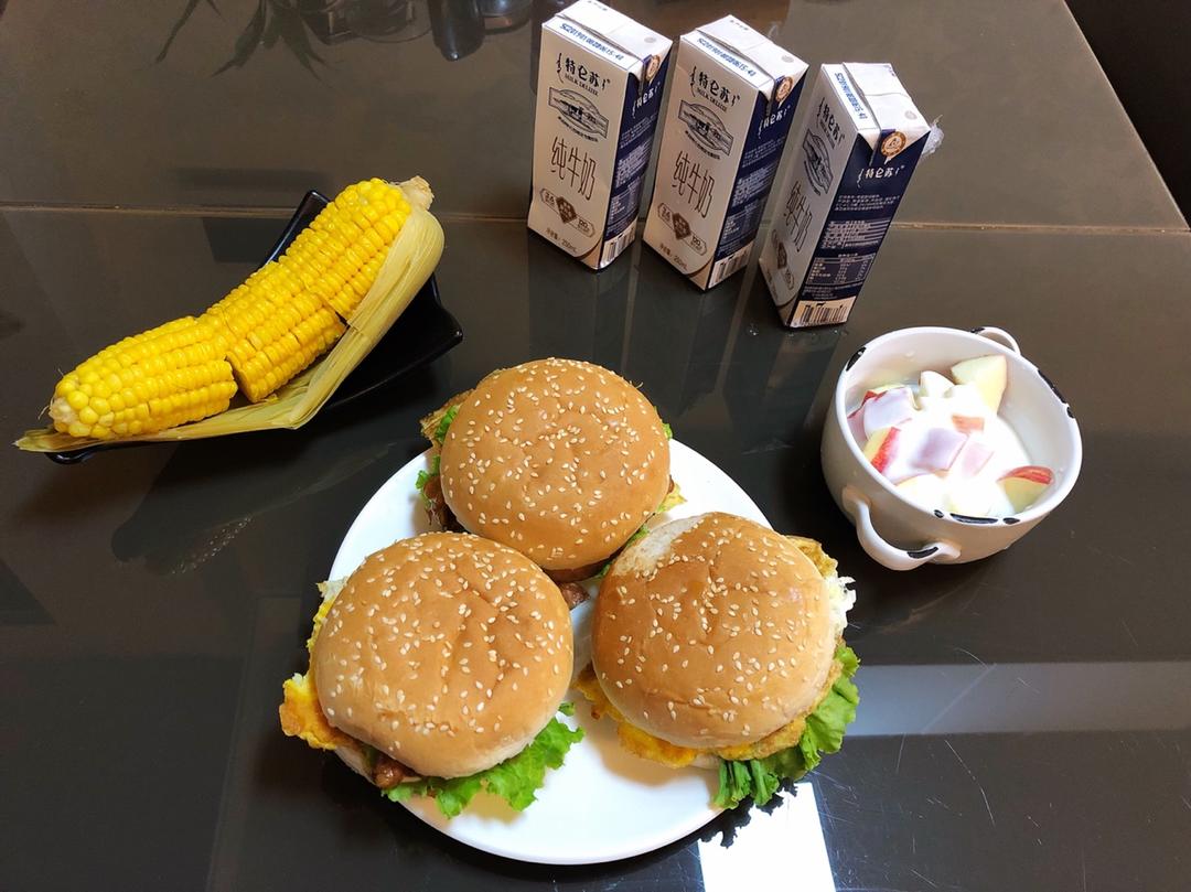 鸡腿汉堡🍔&鲜牛奶🥛&玉米🌽&酸奶沙拉🥗