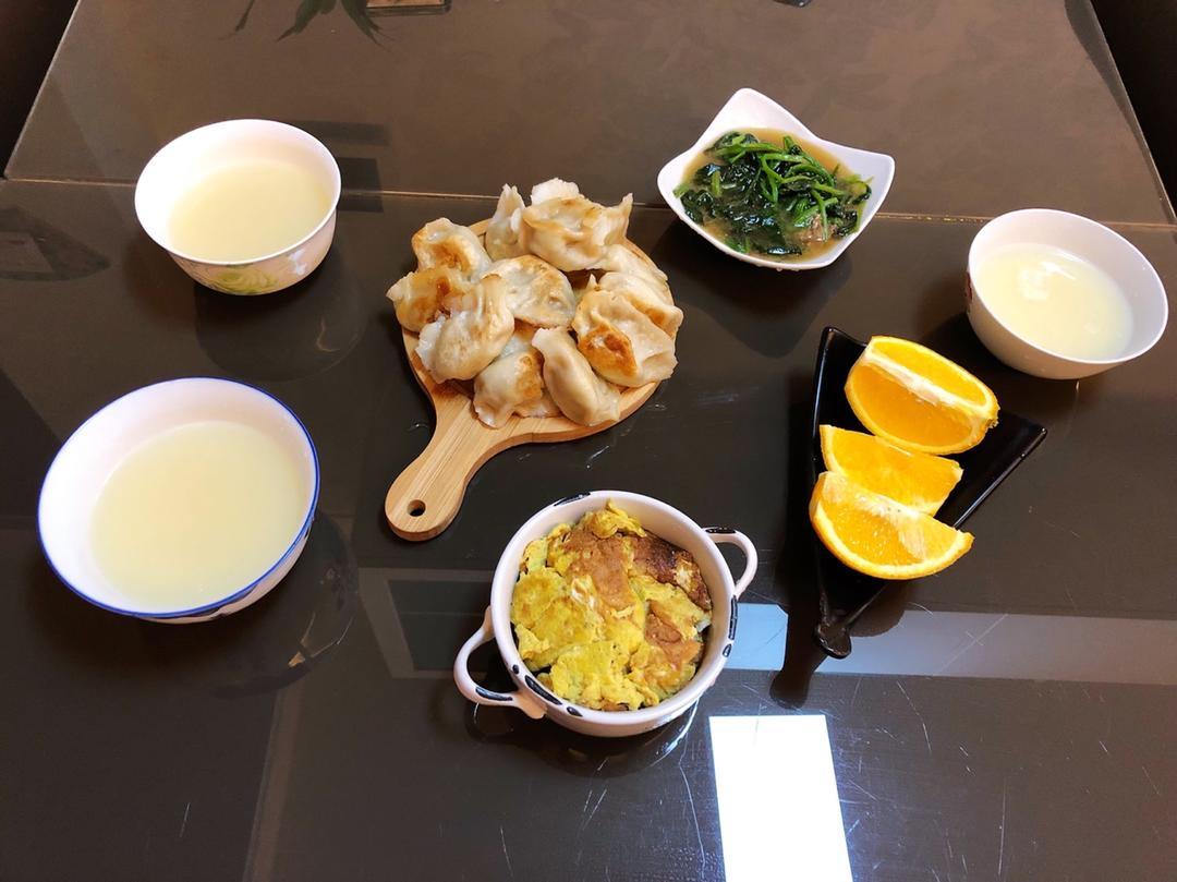 煎饺&烧鸡蛋&小米粥&菠菜汤