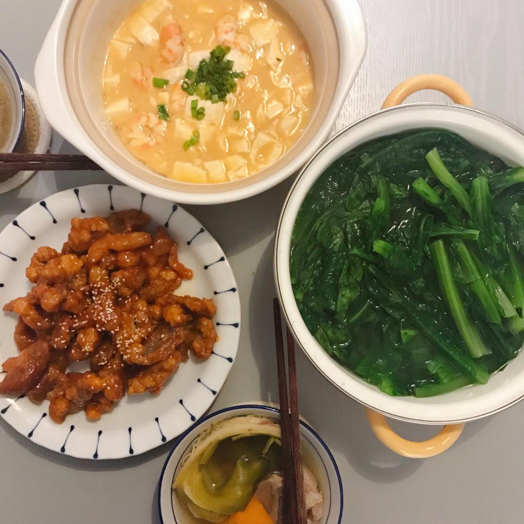 咸蛋黄豆腐羹+糖醋里脊+烫油麦菜……第一次试油炸这种烹调方式
