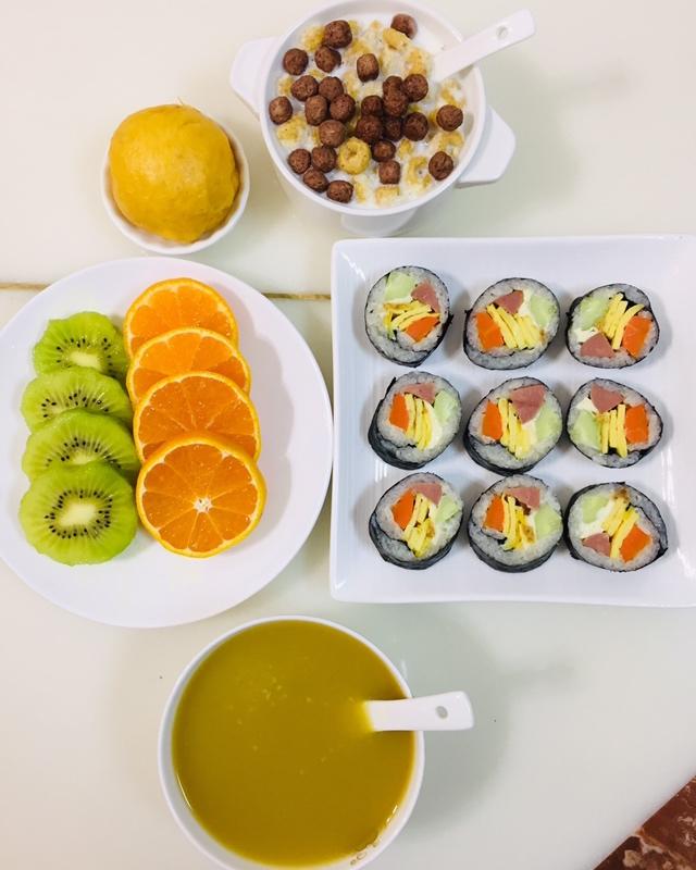 补传10月26日的早餐:红薯羹、糯米寿司、南瓜馒头、牛奶泡麦圈、猕猴桃桔子