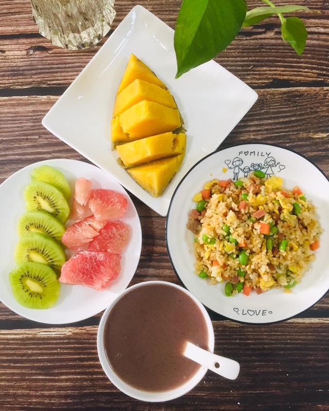 补传10月24日的早餐:燕麦紫米玉米糊、青豆胡萝卜炒蛋饭、蒸红薯、猕猴桃蜜柚