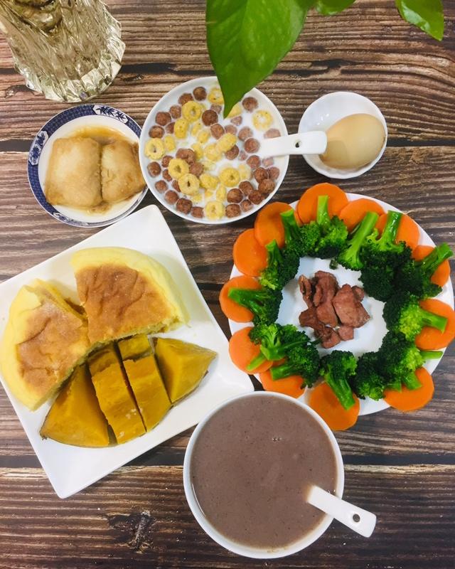 高三女生的美丽早餐:紫米玊米燕麦汁、牛奶泡麦圈、玉米饼、蒸红薯、鸡蛋、胡萝卜西兰花、牛里...