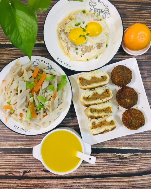 高三女生美丽早餐:红薯玉米羹、葱花肉馅煎饼、蔬菜球、肉蒸蛋、炒藕片。
