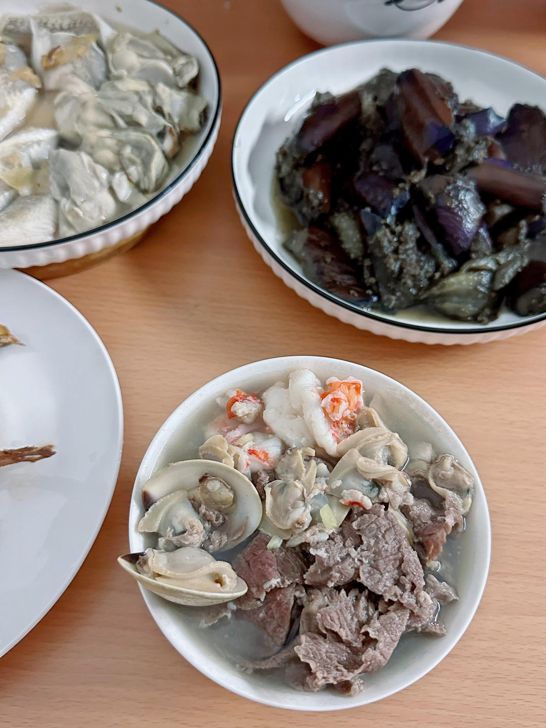 海虾牛肉丸枸杞汤,鱼,排骨酸菜焖土豆,四季豆。