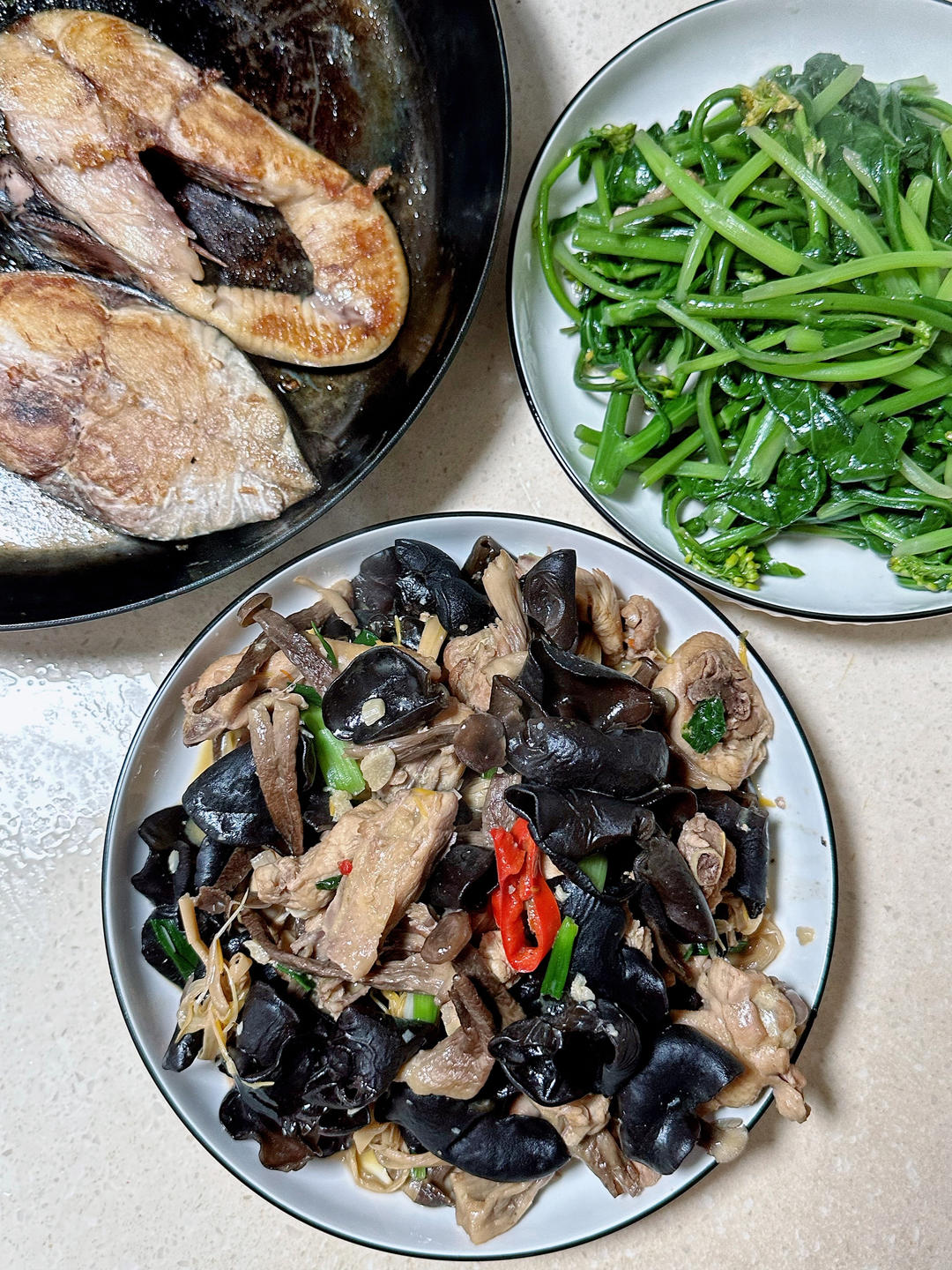 马鲛鱼,走地鸡焖鹿茸菇黄花菜黑木耳,芥蓝。