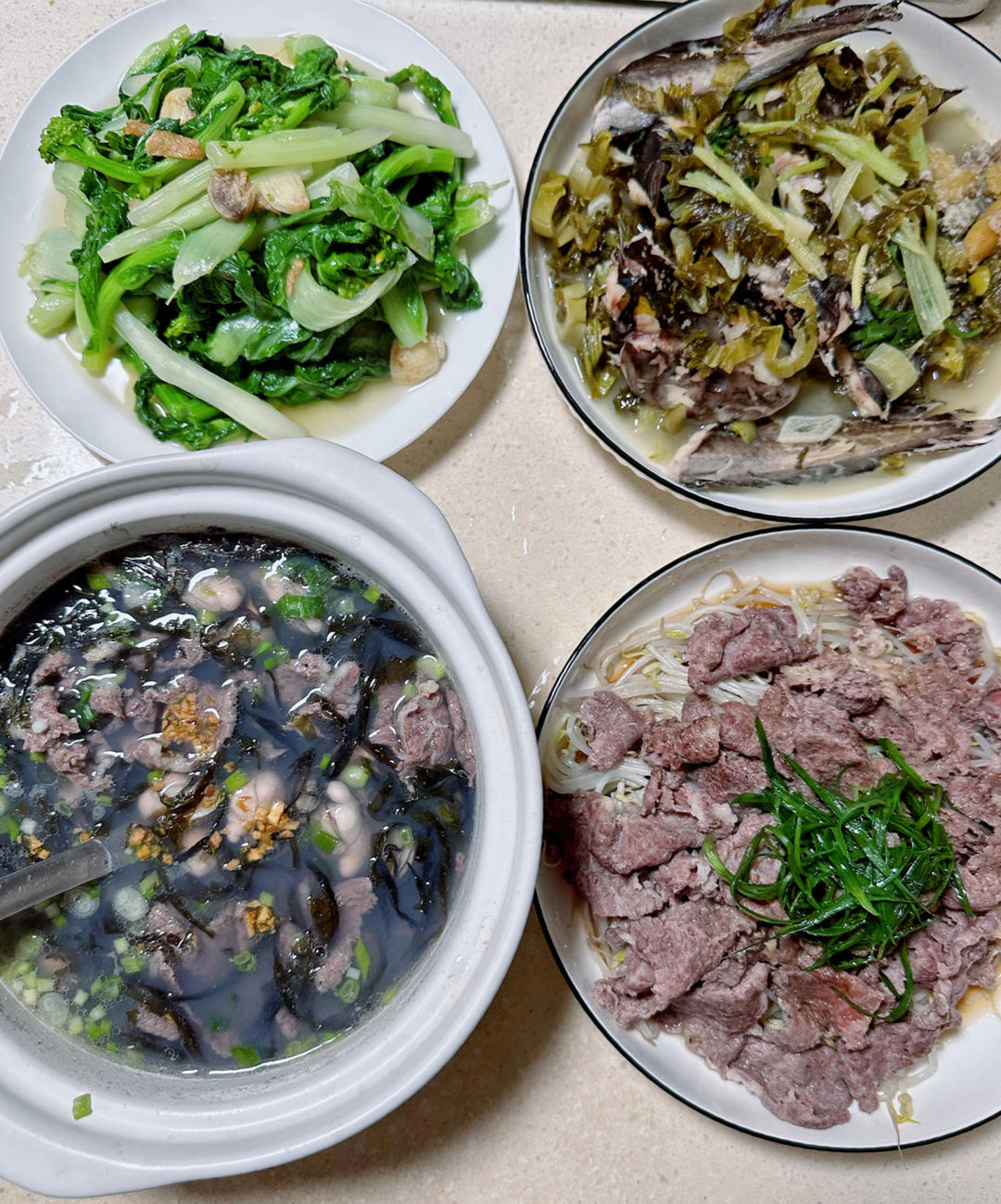 雪花牡蛎紫菜汤,酸菜沙毛鱼,雪花绿豆芽,白菜心。